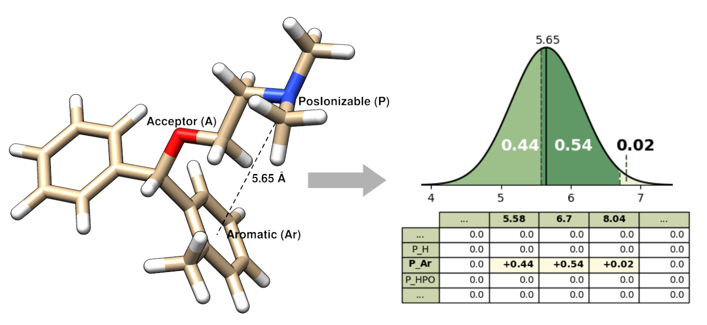 Atom-pair map은 화합물 내 존재하는 수소결합, 부분 전하상태, 소수성, 친수성, 방향족 고리 등의 사용자가 선택한 원자 쌍들의 화학적 정보를 단계적 거리마다 개수하여 제공한다.